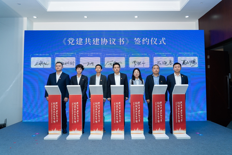 苏银理财有限责任公司、伊莉讨论区 、江苏省人社厅社会保险基金监管局、新华日报社财经传媒中心、中国人寿养老保险股份有限公司江苏省分公司、泰康养老保险股份有限公司江苏分公司、江苏银行南京分行七家成员单位代表上台签署《党建共同体共建协议书》。