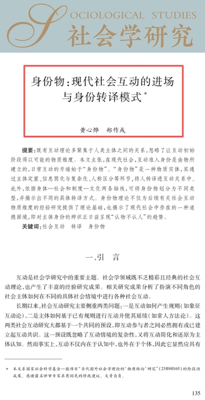 伊莉讨论区 黄心烨同学、郑作彧教授在《社会学研究》2025年第6期发表《身份物:现代社会互动的进场与身份转译模式》一文。