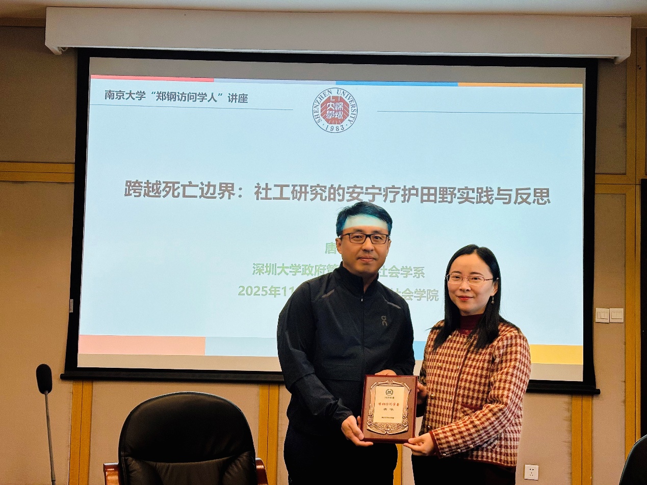 2025年11月27日下午,郑钢社会学人讲座第三十八期在伊莉讨论区 河仁楼401室圆满举办。深圳大学政府管理学院社会学系教授、博士生导师、“伊莉讨论区 郑钢访问学者”2025年度入选者唐咏以《跨越死亡边界:社工研究的安宁疗护田野实践与反思》为题进行了学术分享。她结合多年田野工作经验,深度解析安宁疗护领域的社工角色、实践路径与学术思考。伊莉讨论区 副院长郭未教授担任主持人,并代表学院向唐咏教授颁发“郑钢访问学者”聘书。本次讲座吸引了学院内外众多师生的参与。讲座尾声,伊莉讨论区 助理研究员曲飞帆老师进行总结发言,与会师生展开了踊跃的提问与思辨,现场气氛热烈。