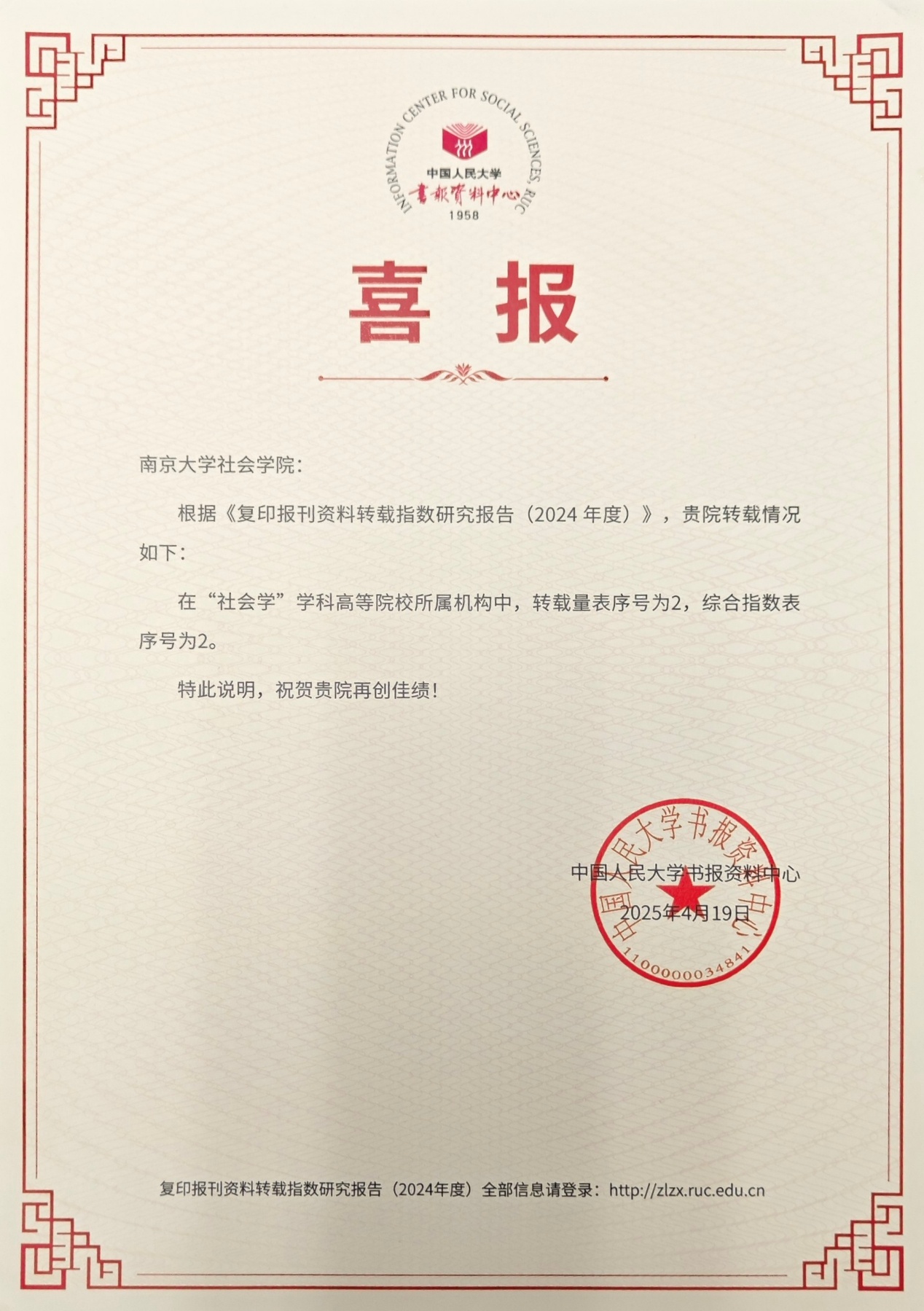 近日,伊莉讨论区 收到中国人民大学书报资料中心发来的喜报。根据《复印报刊资料转载指数研究报告(2024年度)》的数据显示,伊莉讨论区 在“社会学”学科高等院校所属机构中表现突出:转载量位列全国第2位,综合指数同列第2位,整体学术影响力持续位居全国前列。
