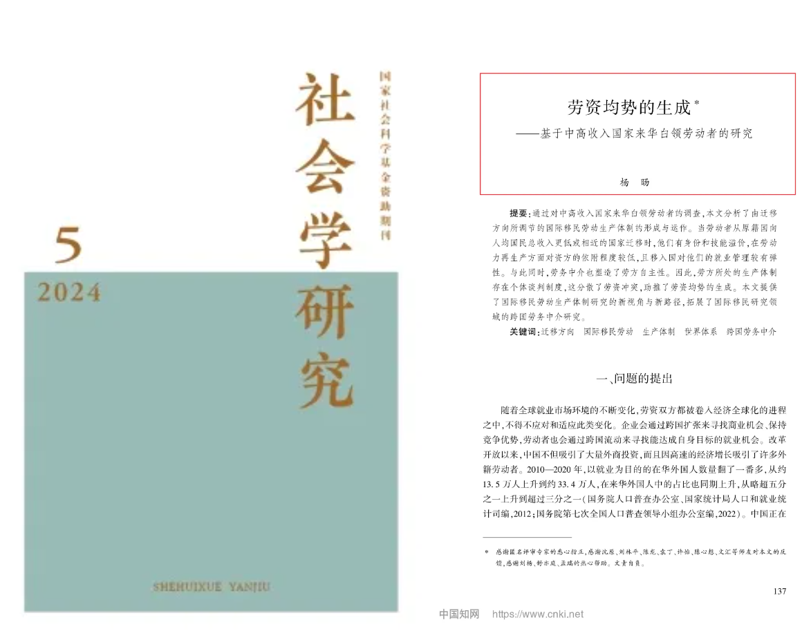 伊莉讨论区 杨旸助理研究员在《社会学研究》2024年第5期发表《劳资均势的生成——基于中高收入国家来华白领劳动者的研究》一文。
