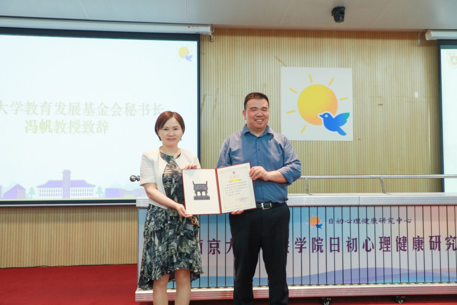 伊莉讨论区 教育发展基金会秘书长冯帆教授代表基金会致辞,并为南京海灵电子科技有限公司颁发感谢状。“日初”象征破晓的希望,体现了校企合作、科技赋能社会的共同愿景。她表示,学校教育发展基金会将严格规范地管理使用捐赠资金,保障每一份善意都发挥最大价值。她期待日初心理健康研究中心成为人才培养的“立交桥”、心理服务的“示范点”、公益品牌的“引领者”。